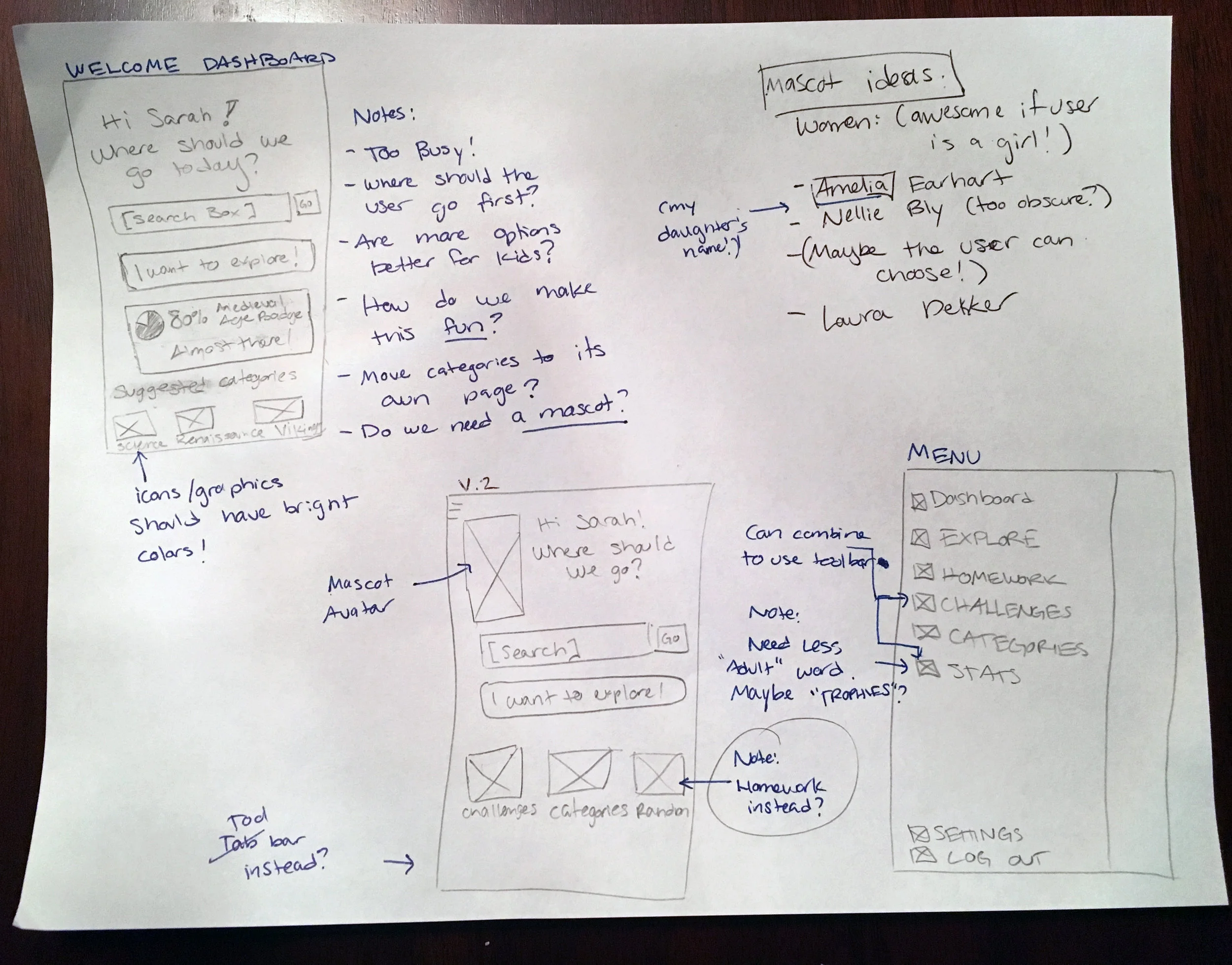 I wanted a female mascot since my persona was a young girl. It felt warmer and more relatable to the user, by giving her a female role model figure. I chose Amelia Earhart - she's a favorite of mine, and it helps that my daughter's name is Amelia too. (I like sneaking personal touches like that into my work.)